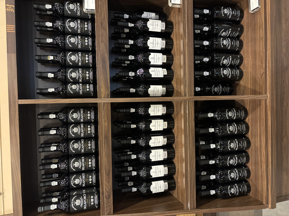 The image captures a static indoor retail display of bottled beverages within Yuanshan, Taiwan. Multiple dark-glass bottles of "DELAFORCE O.PORTO VINTAGE PORT" are uniformly arranged on dark-stained, multi-tiered wooden shelving units. Each bottle features a black label with white text and a central crest, along with a black neck capsule. The top visible shelf primarily displays bottles from the 2006 vintage. The middle visible shelf contains bottles predominantly from the 2001, 2002, and 2003 vintages. The bottom visible shelf is stocked with bottles from the 2007 vintage. The bottles are neatly organized in rows, facing forward within their respective compartments. No individuals, actions, or interactions are present in the scene. Faint Chinese characters, "開封" (unsealed), are visible on a lighter background wall section in the upper right quadrant of the image. The specific establishment or street address within Yuanshan, Taiwan, is not identifiable from the visual information provided.