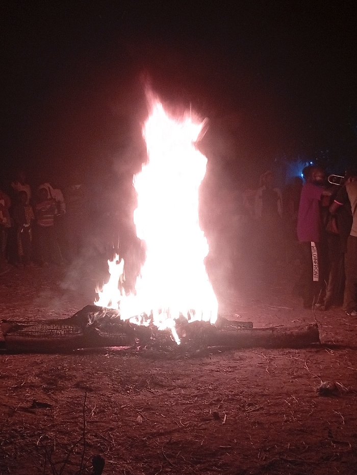 A large bonfire illuminates a dark scene at night, casting an orange-red glow on the surrounding ground