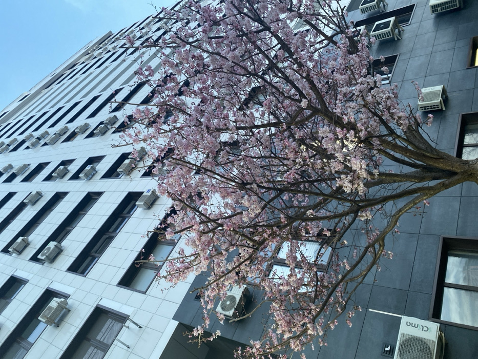 An urban scene in Anapa, Russia, is depicted from a low-angle perspective. A deciduous tree, approximately 6-8 meters in height, stands prominently in the foreground and mid-ground, covered in dense pink blossoms. Its brown, branching structure is visible through the flowers. Directly behind the tree, a multi-story building with a modern facade rises. The upper section of the building is clad in light-colored, possibly white or light grey, rectangular panels, featuring numerous dark-framed, horizontally oriented rectangular windows. A uniform grid of white outdoor air conditioning units is mounted on the building's exterior below various window lines. The lower section of the building, partially obscured by the tree, is surfaced with darker grey panels, also displaying windows and additional white air conditioning units. The sky, visible in the upper right portion of the frame, is clear and light blue. No individuals, active movements, or interpersonal interactions are present in the image.