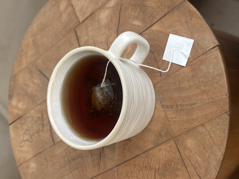 A white ceramic mug with horizontal ridged texturing contains a dark brown liquid. A tea bag is submerged in the liquid, with a white string extending over the mug's rim and connecting to a small, rectangular white paper tag resting on the adjacent surface. This surface is a round, light-to-medium brown wooden table or stool, exhibiting distinct wood grain patterns, irregular cracks, and tonal variations. The surface appears constructed from joined wood pieces, possibly end-grain cuts. Lighting is soft and indirect. No human presence is observed. The location is in the city of Safed, Israel.