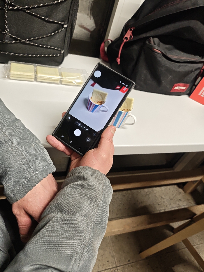 A person wearing a gray denim jacket is taking a picture with a smartphone of two striped mugs, each containing a wafer cookie. The smartphone screen displays the camera app interface. Behind the mugs is a package of cookies, a backpack with white rope straps, and an Eastpak backpack. The scene is set on a white table, and a wooden chair is visible at the bottom right.