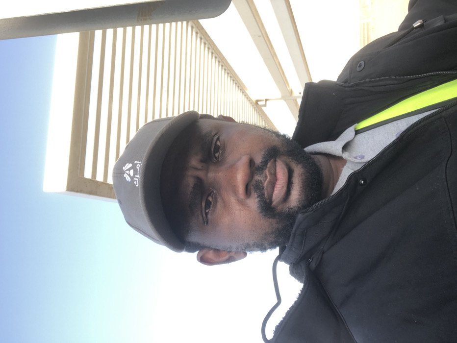 The image is a close-up, selfie-style outdoor portrait of an adult male located in Hanak, Saudi Arabia. The man has a dark complexion, a dark beard and mustache, and is looking directly at the camera. He is wearing a dark grey baseball cap with white Arabic script ("أمرك") and a small white emblem on the front. He is dressed in a black jacket, partially unzipped, revealing a light grey collared polo shirt and a neon yellow reflective strip underneath on his left side. The background consists of a light-colored, possibly metal or concrete, overhead structure with multiple horizontal slats and a vertical support column, set against a clear, bright blue sky, indicating a daytime scene.