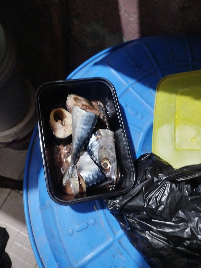 - "The scene in Mape, Nigeria, features a black rectangular plastic dish containing several cuts of raw fish, likely mackerel, partially submerged in a dark liquid" by FM-3EyKx2, licensed under CC BY 4.0
