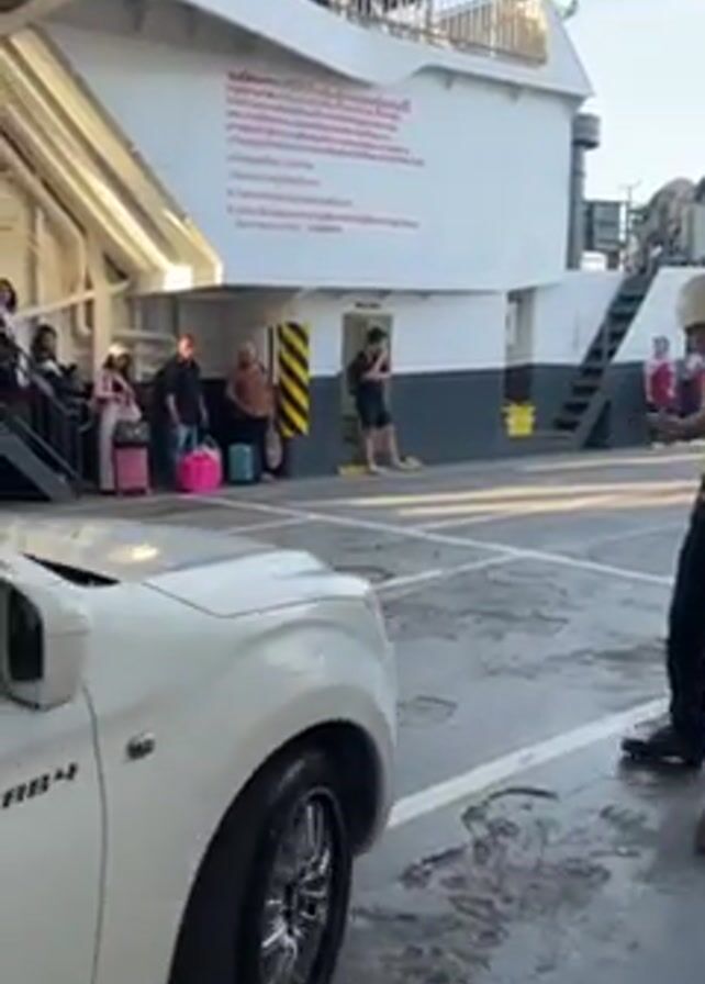 The video depicts a white pickup truck being directed to drive onto a ferry. A worker in a reflective vest and hardhat guides the vehicle with hand gestures. Passengers with luggage are lined up on the deck, waiting to disembark or board. The ferry's structure, with its white walls and upper levels, is visible. The weather appears sunny.