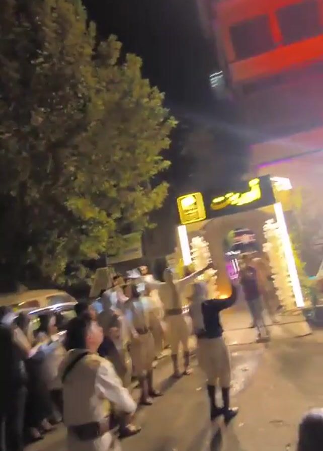At night, a group of men in traditional clothing dance and play instruments in front of a building with a lit-up sign in Arabic. People are gathered around watching and filming. There is a tree to the left and cars parked on the side of the street. The building behind them is lit up in red.