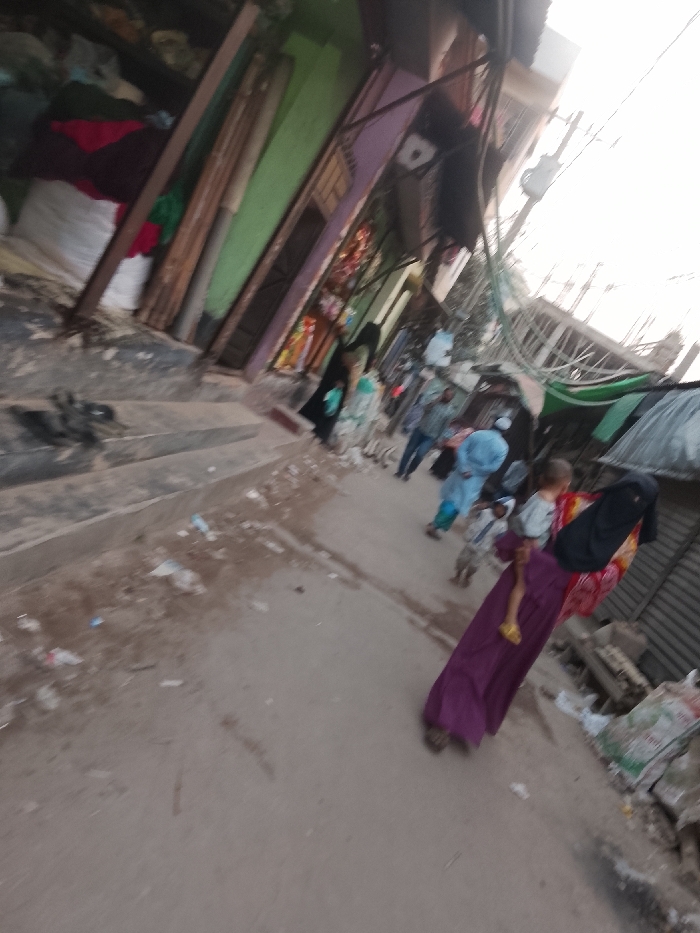The image depicts a tilted, blurry view of a street scene in Tarabo, Bangladesh, during daylight. The street surface is light-colored and uneven, with scattered litter including plastic items and paper debris. On the left side of the street, multi-level structures with distinct green and purple facades are visible. The ground level openings of these structures reveal bundled textiles and other merchandise, indicating commercial establishments. A set of concrete steps is also present on the lower left leading up from the street. Numerous overhead wires, forming a dense network, traverse the upper portion of the scene. On the right side, corrugated metal structures, consistent with market stalls or building exteriors, are partially visible. In the foreground, a person wearing a long purple garment and a black head covering is seen carrying a small child on their left hip. The child is dressed in a light-colored top and yellow footwear. In the midground, several other individuals are present: one person is clad in a light blue long garment, another in a patterned light-colored garment, and a third person wears a darker top and blue trousers. A smaller child is also visible within this group. The scene portrays an active, populated urban environment.