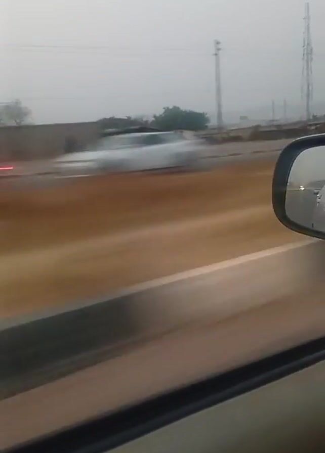 view from inside a moving car, looking out the passenger-side window. The road is visible alongside a wide shoulder of reddish-brown dirt. A motorcycle with two riders can be seen briefly on the road. Beyond the road, there's a wall and some vegetation. Power lines and a transmission tower are visible in the distance, all under a grey, overcast sky. The rearview mirror of the car is visible in the frame. The motion is consistent with a car driving on a highway.