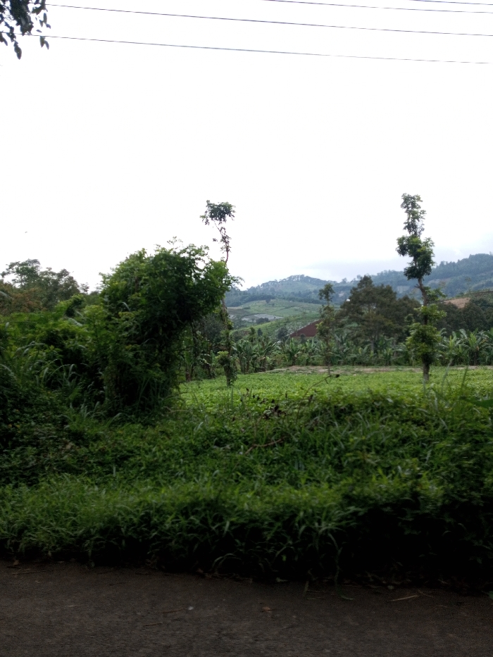 The image displays a rural landscape in Ariyalai, Sri Lanka. In the immediate foreground, a dark asphalt surface occupies the bottom section. Above this, dense, untrimmed green vegetation, comprising tall grasses and various bushes, dominates the lower and left mid-sections of the frame. The midground features an expansive, cultivated field planted with uniform, short green crops, consistent with agricultural production. This field is interspersed with several slender, tall trees characterized by minimal foliage concentrated at their apexes. Further back within the field, clusters of broad-leaved plants, resembling banana trees, are visible. A small structure with a reddish-brown roof is partially obscured by vegetation in the mid-distance on the right side of the field. The background reveals a series of vegetated hills and mountains under an overcast, light grey sky. Two dark, horizontal utility lines span the upper portion of the frame. No individuals or actions are depicted within the scene.