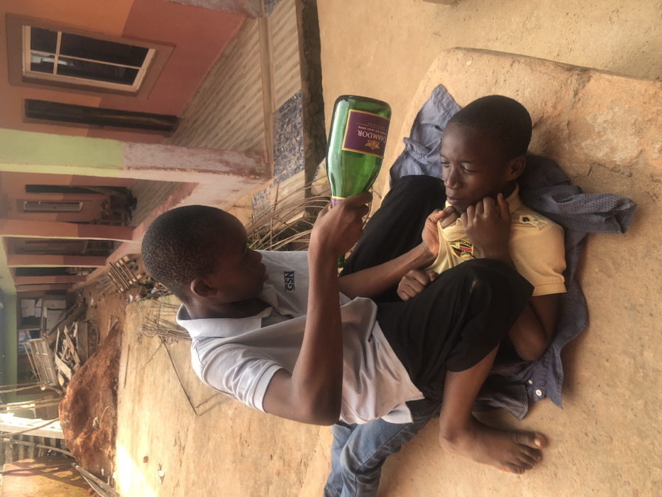 Nkwelle, Nigeria. The scene depicts two male individuals, appearing to be children or young adolescents, on a reddish-brown dirt ground outdoors. An older individual, wearing a light blue polo shirt with "GSN" on the chest and black pants, is straddling the torso of a younger individual. The older individual is barefoot and holds a green glass bottle, labeled "CHAMDOOR," horizontally above the younger individual's head. The younger individual lies on his back, wearing a yellow shirt and resting on a blue denim-like fabric, with his hands near his face, his eyes partially open. In the background, a multi-unit building with a covered walkway is visible, painted in tones of orange and light green, featuring windows with dark panes. To the left, a large pile of reddish-brown dirt and assorted construction debris, including rebar and wooden planks, indicates an active construction or renovation site.