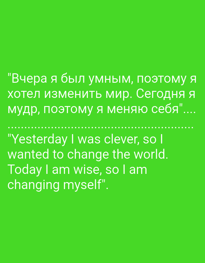 The image displays a digital graphic on a solid, vibrant green background. The primary subject is a philosophical quote presented in white sans-serif typeface. The upper portion of the text is in Russian: "Вчера я был умным, поэтому я хотел изменить мир. Сегодня я мудр, поэтому я меняю себя".... A horizontal line composed of white dots separates the Russian text from its English translation, which reads: "Yesterday I was clever, so I wanted to change the world. Today I am wise, so I am changing myself". No individuals, objects other than the displayed text, or explicit actions are depicted. The environment is a digital display or graphic, situated in Unknown, Unknown.