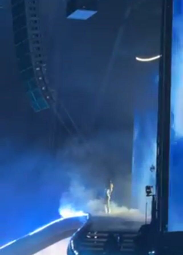 concert stage with a performer standing in a cloud of fog. The stage is elevated and has stairs leading up to it. There are large speakers hanging from the ceiling. The background features a video screen displaying clouds. Blue lighting illuminates the scene.