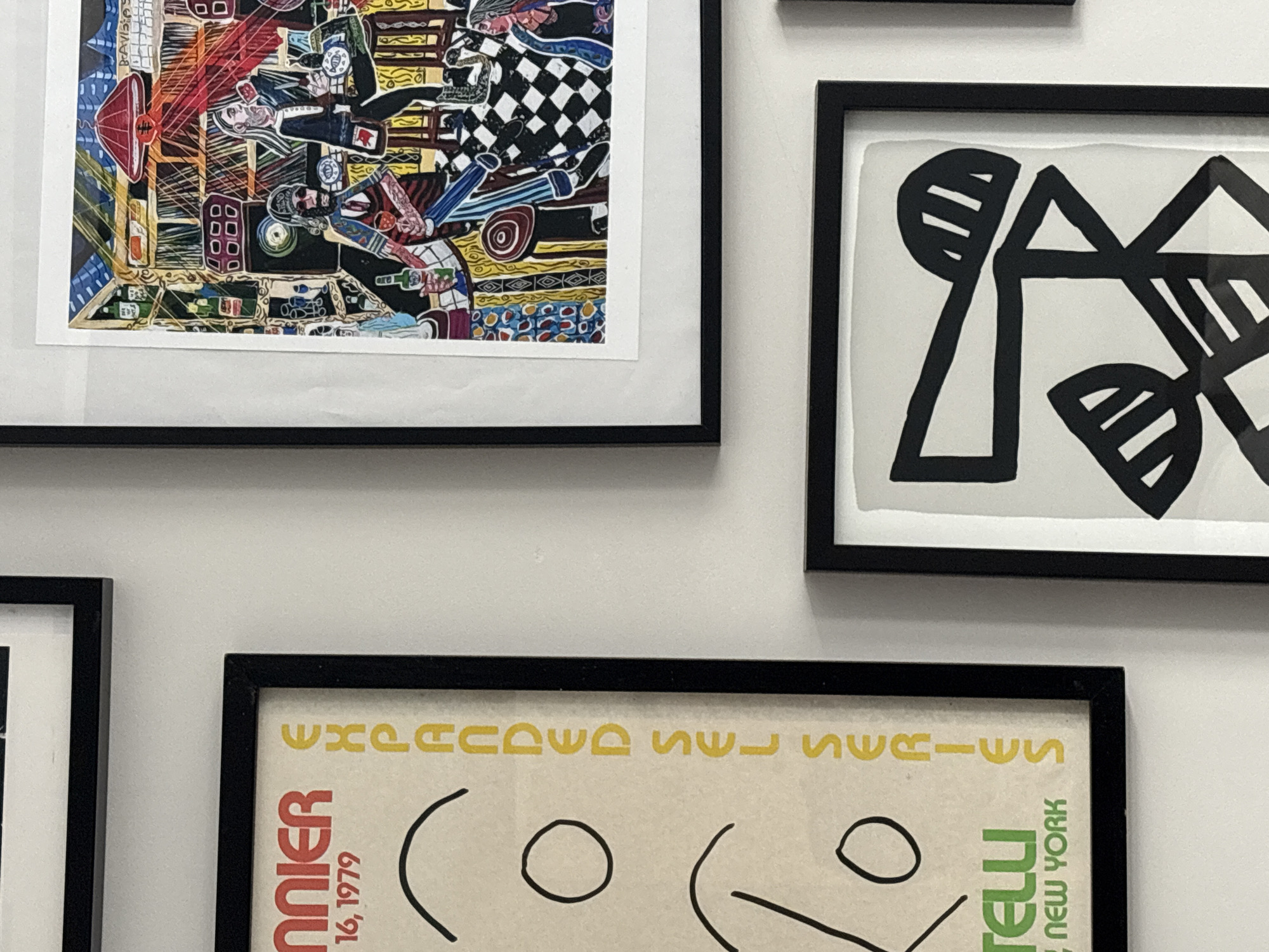The image displays a white wall adorned with multiple framed artworks, located in Manchester, United Kingdom. On the left, a vertical black-framed poster is visible. The poster has a light beige background with abstract black line art, including curved lines and circles. Red and green text is present, partially reading "NNIER 16, 1979" in red, and "TELLU NEW YORK" in green at the bottom. Yellow vertical text along the right edge of the poster reads "EXPANDED SEL SERIES". The visible text elements strongly suggest this is a poster for a music artist, likely Elvis Costello. To the right, a larger, horizontally oriented, black-framed artwork is prominently displayed. This is a colorful, illustrative piece depicting an interior scene of a bustling bar or club. Key features include a distinctive black and white checkered floor. Two primary male figures are central: one on the left with long dark hair, a beard, wearing a patterned cap, vest, and striped trousers, holding a green bottle and a glass of red liquid; another figure to the right, behind a counter, with long light-colored hair, dressed in a dark jacket and white shirt, holding a glass. The background details include shelves packed with bottles and records, and a red bell-shaped lampshade hanging from the ceiling. This artwork graphically represents the interior of **The Hacienda nightclub**, a well-known music venue formerly located at 11-13 Whitworth Street West, Manchester, United Kingdom. Below this colorful artwork, another black-framed piece is partially visible. This artwork features bold, abstract black geometric lines and shapes on a white background. A fourth, largely obscured black frame is visible at the top of the image. The wall itself is uniformly painted white.