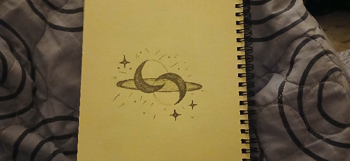 An open, light yellow, spiral-bound notebook rests on a grey quilted surface, which displays a pattern of interconnected black wavy lines. The notebook is positioned with its spiral binding on the right. Centered on the visible page is a pencil drawing depicting two dark crescent moon shapes, overlapping slightly, within a faint circular outline. An oval ring surrounds these central elements. Numerous small four-pointed stars and short radiating lines, indicating sparkle, are scattered around the celestial imagery. The drawing employs shading to give the moons a three-dimensional appearance. This scene is located in Al-Midan Municipality, Syria.
