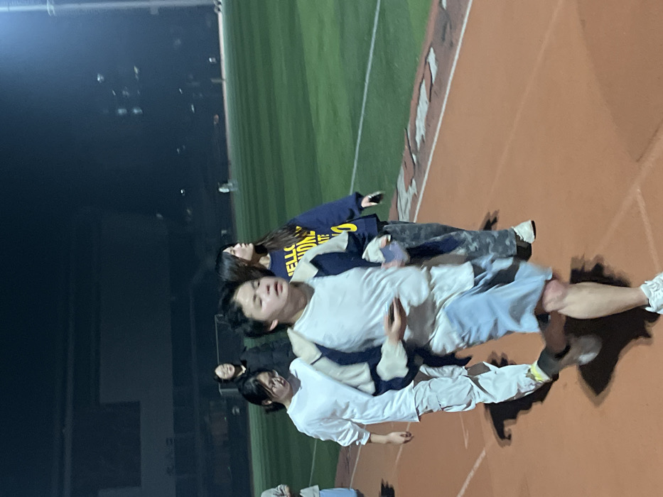 The image captures an outdoor athletic track illuminated at night, located in Jiangjin, China. In the foreground, a young individual, appearing male, is running on the terracotta-colored track, wearing a white t-shirt, light blue shorts, and a blue and white athletic jacket. They are holding a white cellular phone in their right hand, with an expression of exertion on their face. To the left of this runner, a young female wearing glasses and a loose-fitting white long-sleeved shirt with matching white cargo-style pants is walking. To the right, another young female with long dark hair, dressed in a dark blue sweatshirt with yellow lettering and camouflage-patterned pants, is walking, holding a dark object, possibly a phone, in her left hand. Further in the mid-ground, a fourth female figure, wearing glasses and a dark jacket, is walking on the track. The background features a striped green sports field, likely artificial turf, adjacent to the track. Beyond the field, stadium seating structures and tall light poles are visible under a dark night sky, indicating artificial illumination of the facility. Several other indistinct figures are present on the field and in the distant background.