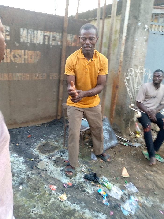 A man in a yellow shirt and brown pants stands outdoors, seemingly applying something to his hands. Litter and debris are scattered on the ground around him. In the background, a person sits on a decorative metal chair, and part of a metal door with faded lettering is visible. The setting appears to be an industrial or semi-urban area.