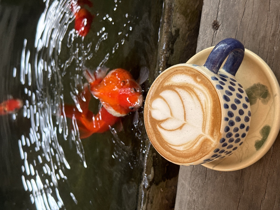 An aerial shot shows a patterned blue and white ceramic cup of latte art on a saucer, sitting on a wooden surface. Beside the cup is a dark pond where several orange goldfish swim. The water surface reflects light, creating blurred patterns above the fish. The composition juxtaposes the crafted coffee and the natural aquatic scene.