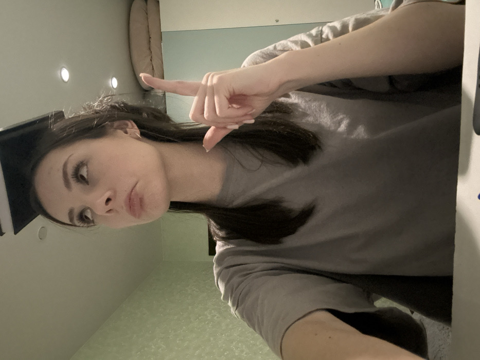 A young female subject is depicted indoors in Kudrovo, Russia. She has dark hair, a light complexion, and is wearing a grey short-sleeved t-shirt. A dark, rectangular object, consistent with a book or notebook, is balanced horizontally on her head. Her lips are pursed, and her gaze is directed upwards and to her right. Her right hand is raised, with the index finger extended vertically. The background on the left features a textured light green wall. The background on the right includes a light blue-green wall panel, a white cupboard door, and a light brown, oval-shaped object positioned above the cupboard. Recessed lighting fixtures are visible in the white ceiling. The subject appears to be seated at a white surface, likely a desk or table, with a dark object visible on it in the lower right foreground.