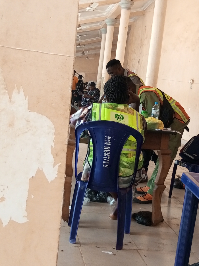 The image depicts an indoor scene in Ajalli, Nigeria, characterized by light-colored walls showing extensive paint peeling on the left foreground. A person with dark braided hair is seated with their back to the viewer, wearing a lime green reflective safety vest bearing a logo and text. They occupy a blue plastic chair with "DD RENTALS" stenciled on the back, positioned at a rustic wooden table. Behind the seated individual, a male with short dark hair, wearing a grey and orange vest, leans over the table. To his right, another individual, partially visible, wears an orange reflective vest and green pants, also attending to the table. A plastic water bottle rests on the table surface. Black plastic bags are visible on the tiled floor beneath the table. A large reflective surface on the left wall captures a broader view of the environment, showing multiple structural pillars with grey capitals, a ceiling equipped with several white ceiling fans, and additional individuals standing and seated in the background, suggesting a waiting area or public gathering.