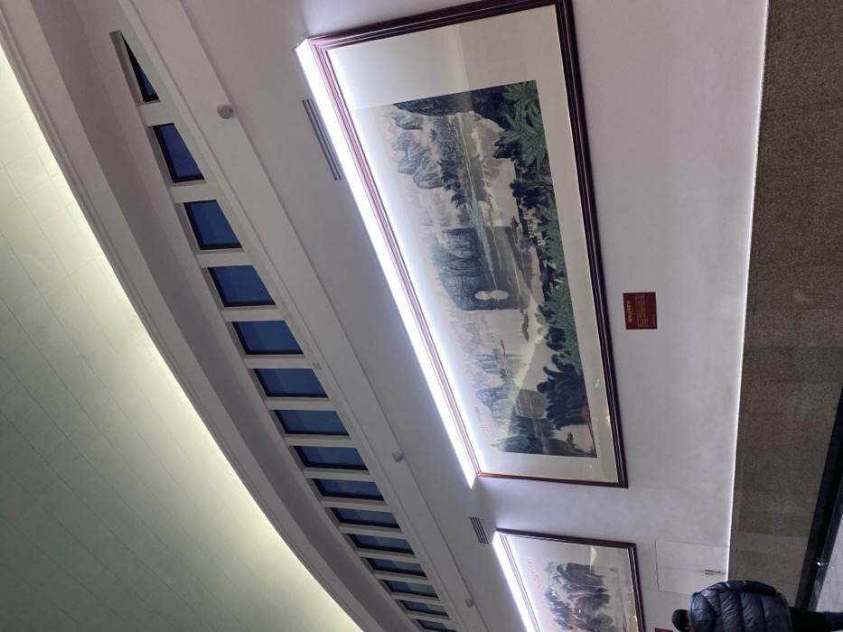The scene depicts an interior hallway or gallery in Dongcheng District, China. A vaulted, light-colored ceiling with a subtle grid pattern is illuminated by an upward-facing cove light. Below the ceiling, a white architectural feature displays a series of regularly spaced, narrow rectangular windows with dark blue panes. The primary wall surface is white, featuring two large, framed horizontal landscape paintings. The prominent painting in the foreground depicts a traditional Chinese landscape with mountains, a body of water reflecting the scenery, and dense foliage, including a distinctive arch-shaped rock formation. This artwork is illuminated by a long, horizontal fluorescent light fixture mounted directly above its dark wooden frame. A second, similar painting is partially visible to the left. A small, red rectangular sign with white text, likely Chinese characters, is affixed to the white wall below the main painting. The lower section of the wall features a darker, textured wainscoting. A single individual, dressed in a dark, puffy jacket, is observed walking away from the viewer in the lower-left portion of the frame. A small white dome-shaped object, possibly a security camera or sensor, is mounted on the white wall above the large painting. An air vent is visible on the wall between the top of the painting frame and the row of windows.