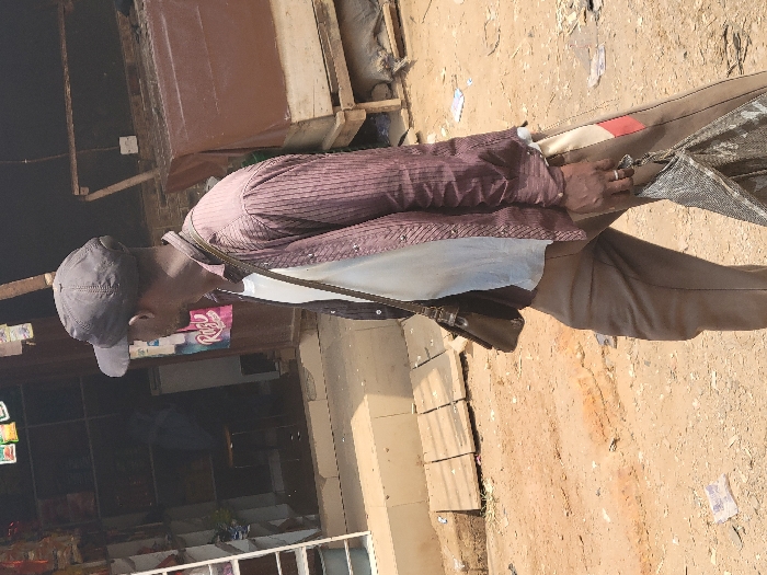 A male individual is depicted walking on an unpaved, dusty street in Awka, Nigeria. He is observed in a three-quarter profile, moving left to right across the frame, with his head slightly turned towards the left. He wears a dark baseball cap, a light-colored undershirt, and an open, vertically striped maroon-brown long-sleeved shirt. His trousers are brown with a light-colored vertical stripe and a red stripe on the outer seam of the right leg. A dark brown shoulder bag is slung across his body. In his right hand, he holds a dark, possibly mesh, bag. A ring is visible on his right ring finger. The immediate background to the left features the entrance to a shop, revealing interior shelving and packaged goods displayed above the doorway. A white vertical shelving unit is partially visible on the far left. A poster with the word "Ragu" is affixed to the wall adjacent to the shop entrance. To the right, a makeshift wooden stall or stand covered with a brown tarpaulin or fabric is present. The ground consists of bare earth with scattered debris.