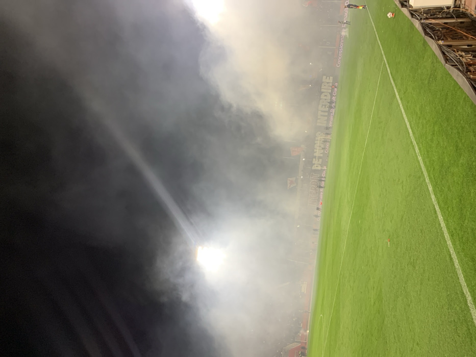The image captures a nighttime scene inside a football stadium in Meknes, Morocco, viewed from an elevated vantage point. Dense, white-grey smoke or fog pervades the atmosphere, primarily occupying the upper sections of the stadium and partially obscuring the playing field. Two powerful stadium floodlights are active, one on the left and one on the right, casting intense beams that cut through the thick smoke. The foreground is dominated by a meticulously maintained green grass football pitch, clearly delineated by white boundary lines. A small, orange conical object or flare remnant is visible on the grass in the left-midground. Near the right sideline, a football (soccer ball) rests on the turf. A dark metal railing or barrier occupies the immediate bottom-right corner of the frame, suggesting the viewer's position within the stands. In the background, red stadium seating is densely populated with a large crowd of spectators, their individual details largely obscured by distance and the pervasive smoke. A prominent white banner with the French text "INTERDIT DE NOUS INTERDIRE" (Forbidden to forbid us) is displayed across a section of the lower stands. Additional, smaller banners or flags are also discernible. Several figures in dark uniforms, likely players or match officials, are faintly visible on the field near the stands, with one figure near the right sideline wearing a dark uniform accented with yellow or orange. The scene indicates an active stadium event, characterized by crowd presence, stadium lighting, and smoke generation, likely from pyrotechnics.