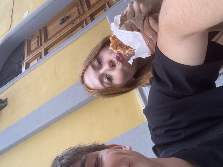 A close-up selfie captures two individuals against a historic Florentine architectural background in Florence, Italy. On the left, the lower-left portion of an individual's face, including a visible eye and part of a black t-shirt, is present, indicating they are taking the photo. To the right, a young woman with long, reddish-brown hair and fair skin is looking directly at the camera, her lips pursed in a pout. She holds a partially consumed, fried food item, possibly a sandwich, wrapped in white paper in both hands. Multiple rings are visible on her right-hand fingers. The background features a light yellow building wall with a diagonal gray architectural trim. Behind the woman, an ornate, tall arched wooden door with a dark metal knocker and an intricate decorative grille above it is visible, characteristic of Florentine architecture.