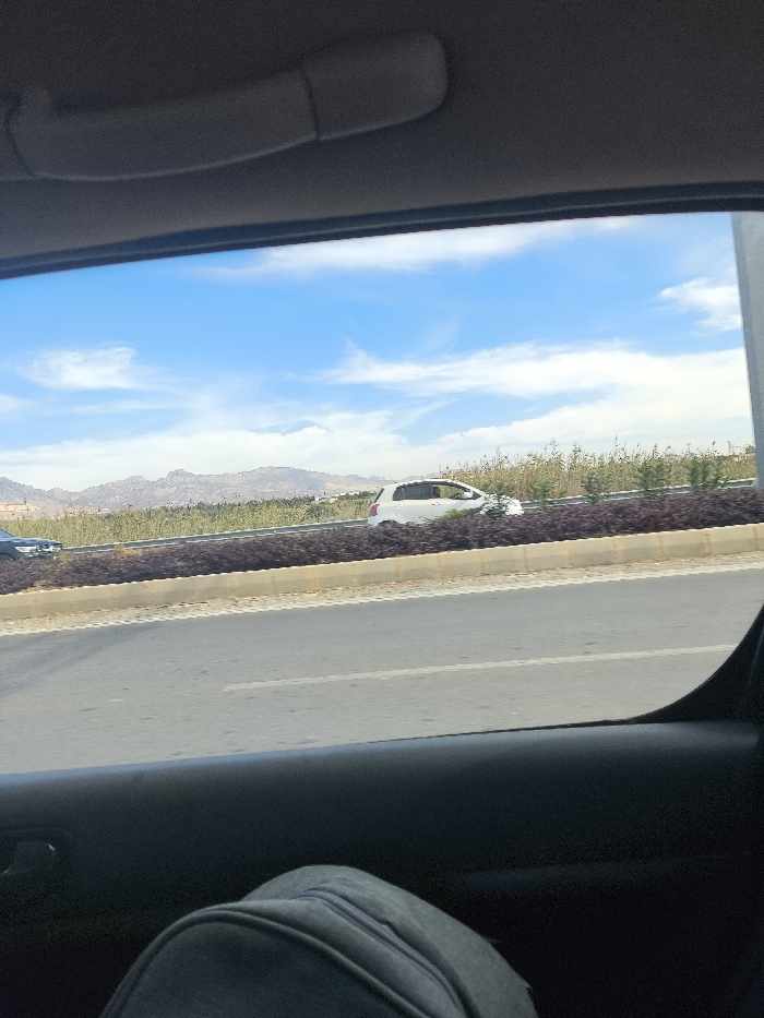 The image captures an exterior road scene observed from within a vehicle, through a side window. The vehicle's interior shows a light grey overhead grab handle against a dark headliner at the top, and a dark grey bag or object in the lower-left foreground. The exterior features a multi-lane asphalt road with a yellow line delineating the shoulder or median. A concrete median barrier separates the lanes, behind which cultivated vegetation is visible: a front row of dark reddish-purple shrubs, followed by a row of taller, light green reedy plants. A silver guardrail runs behind the vegetation. On the opposing lanes, a white hatchback vehicle, consistent with a Toyota Yaris, is in motion from right to left, partially obscured by the median. Further left, a dark-colored vehicle is also traveling in the same direction. The distant background reveals arid, rocky hills or mountains with sparse vegetation and faint structures at their base, under a clear blue sky with scattered white cumulus clouds. The scene is illuminated by bright daylight. The location is Gonyeli, Northern Cyprus / Cyprus.