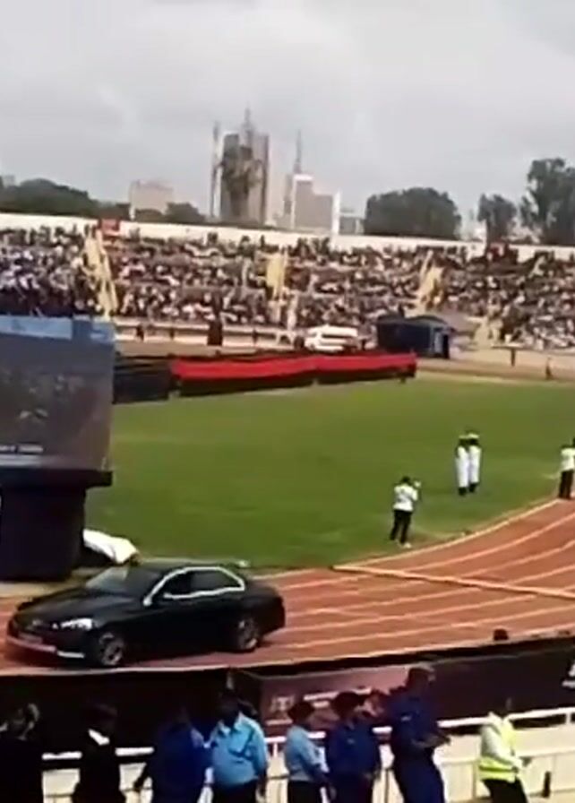 large outdoor stadium, packed with spectators. A procession of vehicles, including cars and motorcycles with riders in white helmets and outfits, is moving along the track around the field. On the field, there is a line of people in white uniforms. Large screens are also set up, displaying images. The overall atmosphere appears to be one of ceremony or a special event.