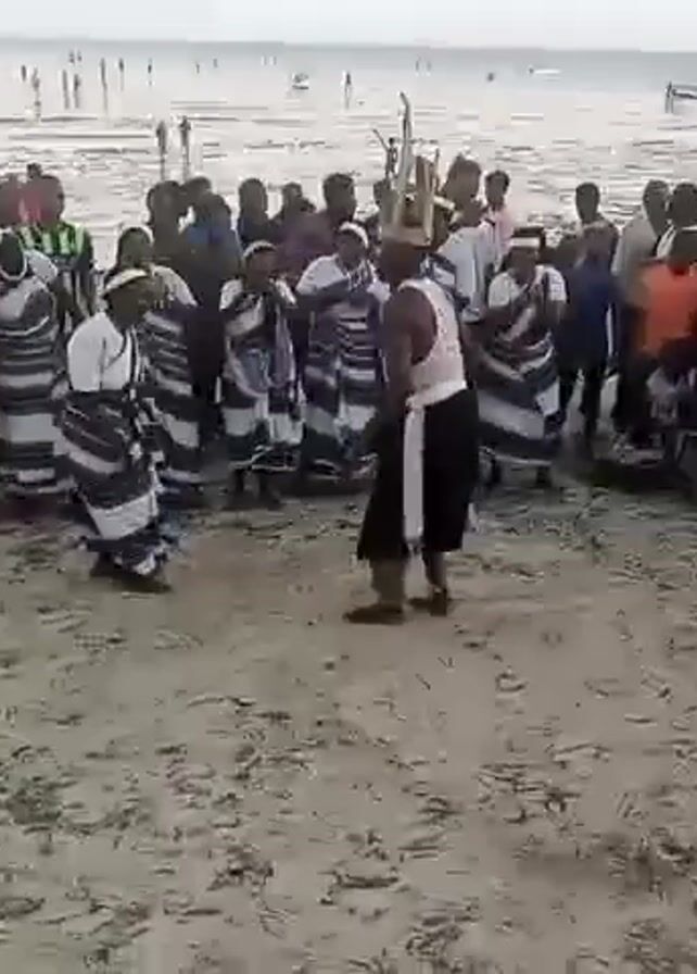 On a beach with many people wading and playing in the shallow surf, a crowd has gathered to watch a dance. The dancers are dressed in black and white striped wrap skirts. The male lead dancer also wears a white tank top and a straw hat. The dance is accompanied by drums and chanting. Someone in the crowd is using a cell phone to record the dance.