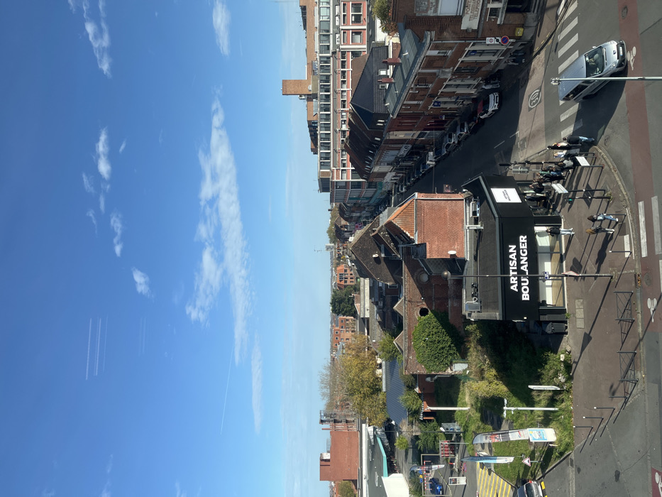 - "This image presents an elevated, forensic view of an urban intersection and surrounding cityscape within Roubaix, France, under a clear, bright blue sky with scattered white cumulus clouds" by FM-NQrs03, licensed under CC BY 4.0