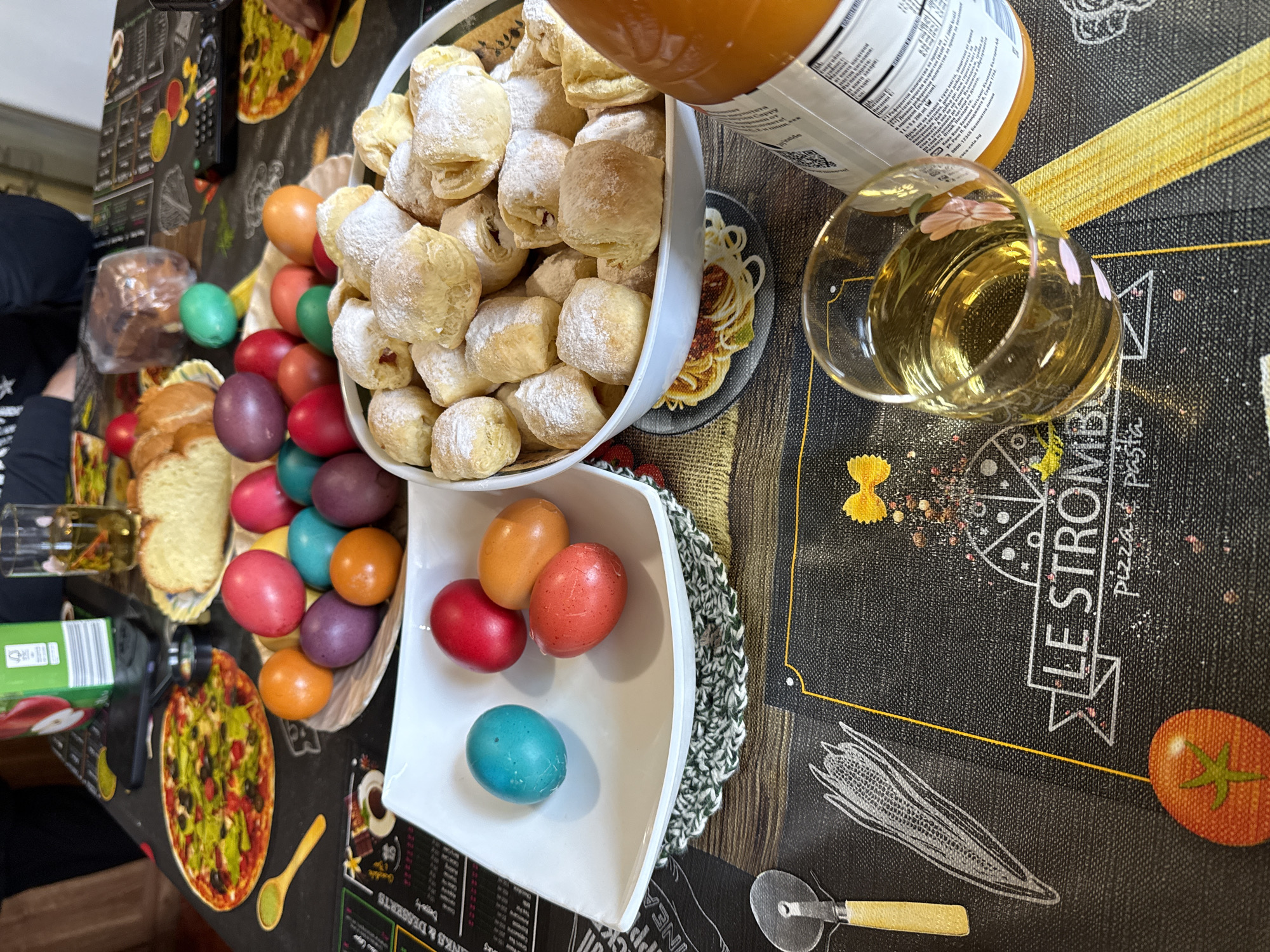 A high-angle shot captures a table laden with food and beverages, suggesting a festive or celebratory gathering. A large white bowl overflowing with powdered pastries dominates the upper center. Nearby, a glass filled with a light-colored liquid and a bottle, partially visible, add to the impression of refreshments. A smaller white bowl containing a few dyed Easter eggs is situated near the larger bowl of pastries. To the left, a basket holds an assortment of colorful Easter eggs, accompanied by sliced bread and a wrapped loaf. The table is covered with a patterned tablecloth, featuring images of pizza, pasta, and culinary-related text. A pizza cutter with a wooden handle rests on the tablecloth. The background reveals a person partially visible on the left side of the frame. The text on the beverage bottle is partially visible, with phrases like "Energiina" and "coca-cola.bg" suggesting it's a commercial product. Text in Bulgarian, including the address of "ул. Кана Халония Ба", indicates the location is likely in Bulgaria. Given that Rosen is a common name in Bulgaria, without additional context, it cannot be definitively determined that this image was taken in the city of Rosen, Bulgaria.