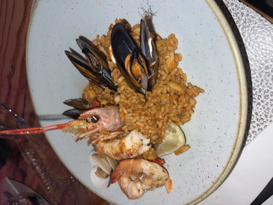 - "A close-up, high-angle image depicts a seafood paella served on a light blue ceramic plate with a speckled dark pattern and a tan-colored rim, positioned within an establishment in Yaiza, Spain" by FM-vBPt73, licensed under CC BY 4.0