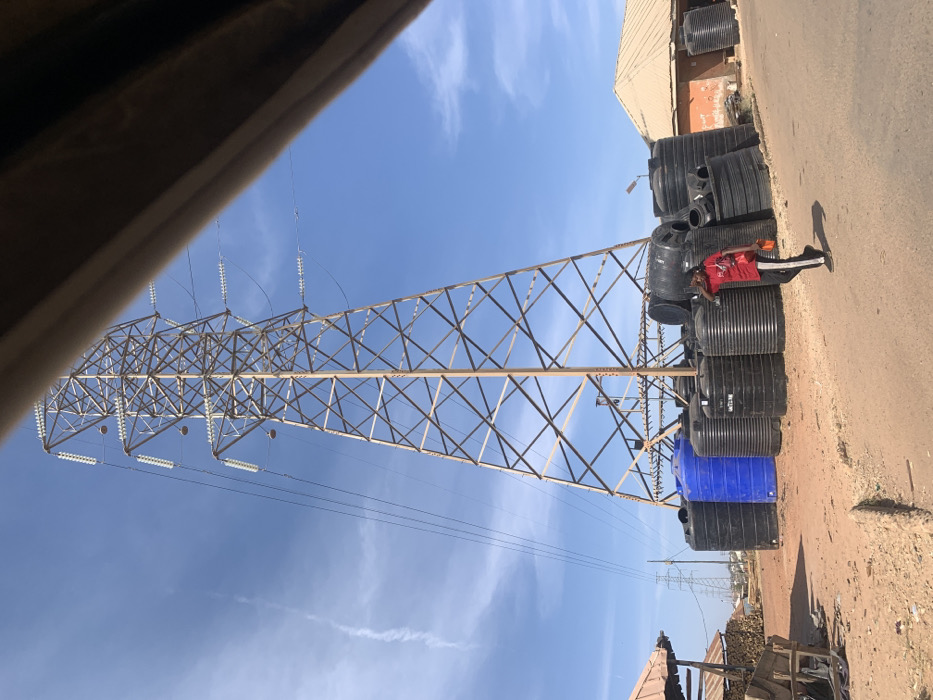 - "The image displays an outdoor scene in Rafin Bauna, Nigeria, centered on a large, multi-level metallic lattice electricity transmission tower standing under a clear blue sky with scattered wispy clouds and a high-altitude contrail" by FM-1vloc2, licensed under CC BY 4.0