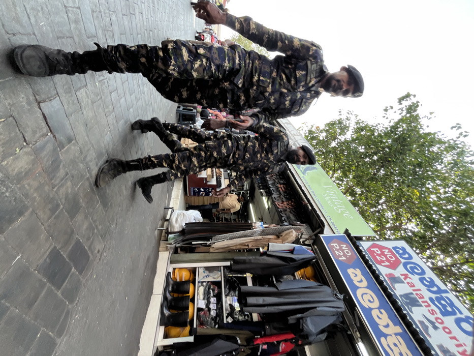 The image depicts a daytime street scene on Front Street, Colombo 11, Colombo, Sri Lanka. In the foreground, two men in camouflage uniforms and dark berets walk from the right towards the left on a paved sidewalk. They both wear dark boots and have beards. A third individual, similarly uniformed, is partially visible behind the second man. To the right, multiple commercial shopfronts are visible. One shop is identified by a green sign reading "Vintage Shoes" with the address "MC/Co. Front Street, Colombo 11". Adjacent to it, another shop named "KalanSooriya" (also displaying "No. P.21") has clothing, black rubber boots, and yellow hard hats displayed outside. An individual in a light-colored shirt is visible inside the "Vintage Shoes" shop. The street surface is composed of interlocking paver bricks. Overhead, green tree foliage is visible against a bright sky. A scooter is partially visible in the distance on the left.