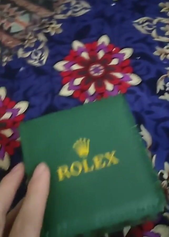 A hand opens a green Rolex box to reveal a silver Rolex wristwatch. The watch has a white face and sits on a white cushion inside the box. The background is a colorful patterned fabric with floral designs.