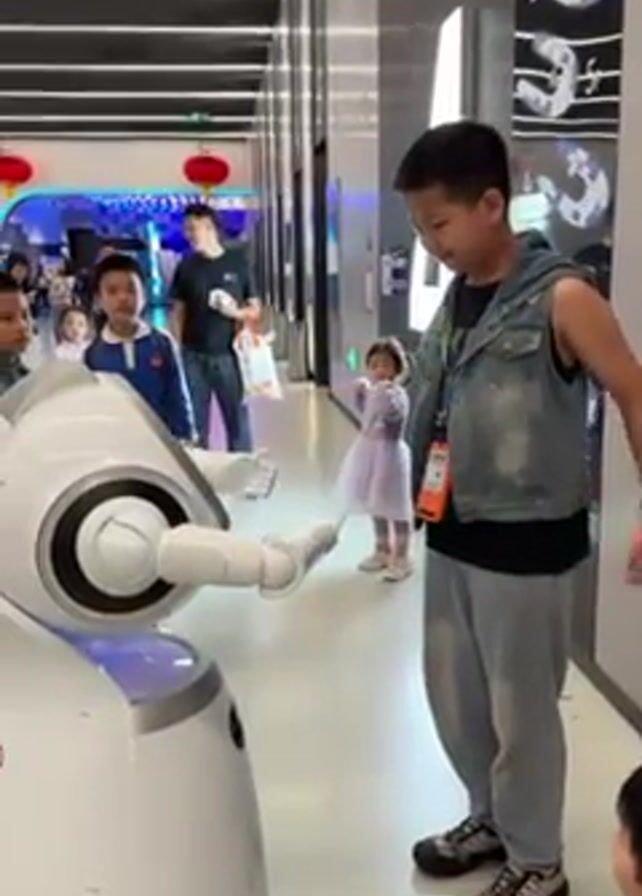 A young boy interacts with a white robot. The robot, with a round body and two arms, stands on a white floor in a well-lit indoor space. The boy, wearing a sleeveless jean jacket and gray pants, gestures towards the robot, and the robot raises its arms in response. Other children and adults are visible in the background, suggesting a public or commercial setting. The environment includes elements of modern design with sleek surfaces and decorative lighting.