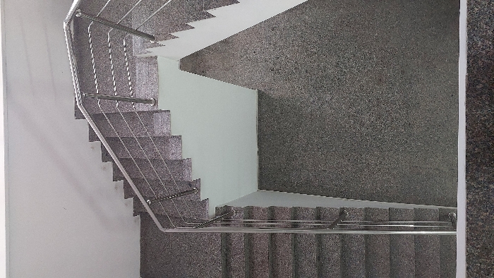 An overhead shot depicts a staircase with gray, textured steps and a stainless-steel railing. The walls are painted white and light green. A portion of the adjacent floor is visible, also gray and textured. The stairs make a 90-degree turn, showcasing the railing's design along the descent. The contrast between the textured surfaces and the smooth, reflective metal creates a visually interesting composition.