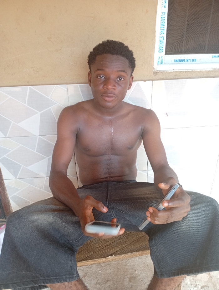 A young, dark-skinned man is seated shirtless, wearing dark jeans. He holds two phones, one in each hand. The background features a textured wall with geometric tiles. Above the tiles, a painted wall meets a window with "EVANSMATHS STANDARD" printed across the top and "CHEEDOZ INT'L LTD" on the side. The man's facial expression appears neutral, with a small mark visible on his forehead.