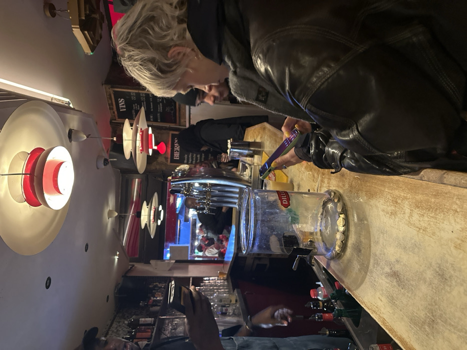 - "A woman in a leather jacket stands at a bar, holding a smartphone and looking down at a glass jar filled with coins" by FM-dD7ro2, licensed under CC BY 4.0