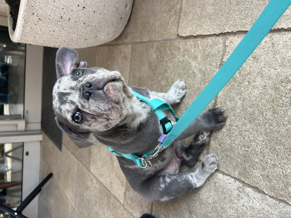 - "A blue merle French Bulldog puppy, fitted with a teal harness and matching leash, sits on a light-colored tiled or stone pavement" by FM-mUsH73, licensed under CC BY 4.0