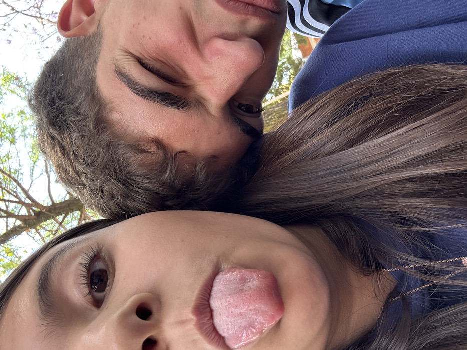 A close-up selfie depicts two individuals in an outdoor setting in Puebla, Mexico, under natural light. A female subject occupies the left portion of the frame, with her left eye open, revealing a brown iris, and her tongue extended from her mouth. She has long, dark brown hair partially draped over a dark blue garment and wears a delicate gold-colored necklace. Adjacent and to the right, a male subject's face is partially visible, angled downwards and resting against the female's head or shoulder. He has short, curly dark brown hair, and his visible left eye is partially closed, creating a squinting or winking expression. His skin exhibits a reddish tone. He is wearing a dark blue garment with white stripes visible on the sleeve. The background is blurred, showing tree branches with green foliage and subtle purple flowers against a bright sky, indicating a sunny outdoor environment.