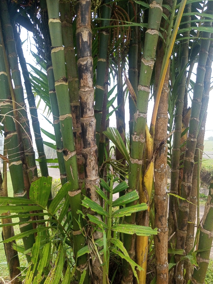 A cluster of bamboo stalks dominates the frame, exhibiting varying shades of green and brown