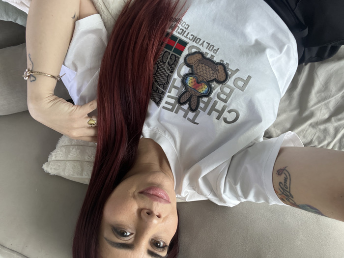 A fair-skinned woman with red hair lies on a grey couch. She wears a white T-shirt with a teddy bear patch and grey lettering. She has visible tattoos on both arms and wears a gold bracelet and a ring on her left hand. Her face is visible, showing defined makeup on her eyes and lips. A white pillow is visible behind her head.