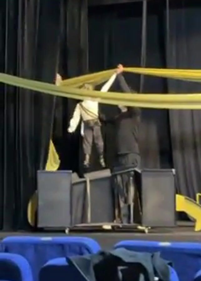 A person dressed in black is on a theater stage manipulating a puppet. The puppet is wearing a white shirt, dark patterned pants, and boots. The person on stage moves the puppet by holding onto a yellow drape that is suspended above. The stage has a backdrop of black curtains with a purple panel on the right side. A section of the theater seating is visible in the foreground.