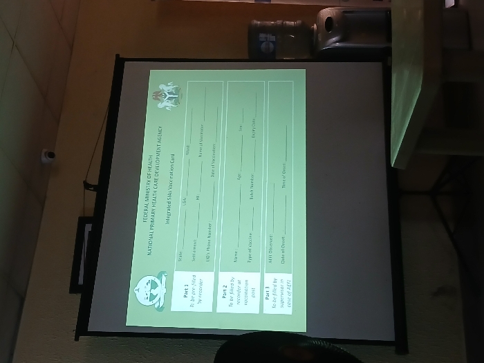 - "An indoor scene features a large white projection screen displaying a digital template for an "Integrated SIAS Vaccination Card" from the Federal Ministry of Health, National Primary Health Care Development Agency, Nigeria" by FM-ueEo62, licensed under CC BY 4.0
