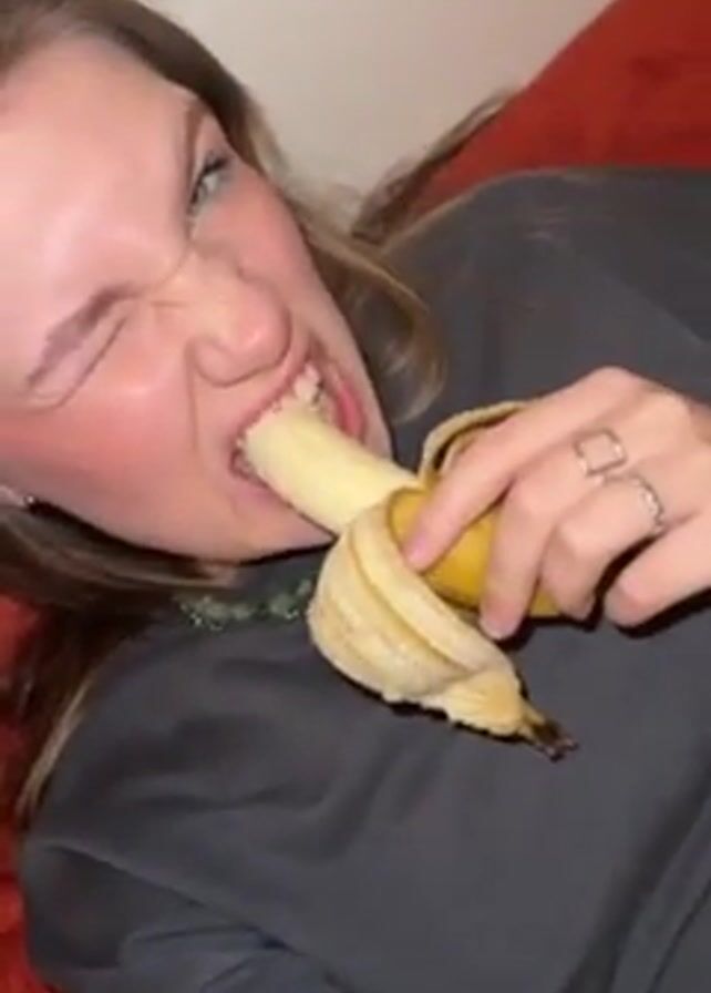 A young woman is lying on a red couch, wearing a dark grey sweater and a chunky silver chain necklace with green stones. She has pale skin, blonde hair, and is wearing makeup, including pink blush and white eyeliner. She bites into a peeled banana, then holds it up to the camera, taking another bite. Her expression is somewhat playful. The background is a plain white wall.