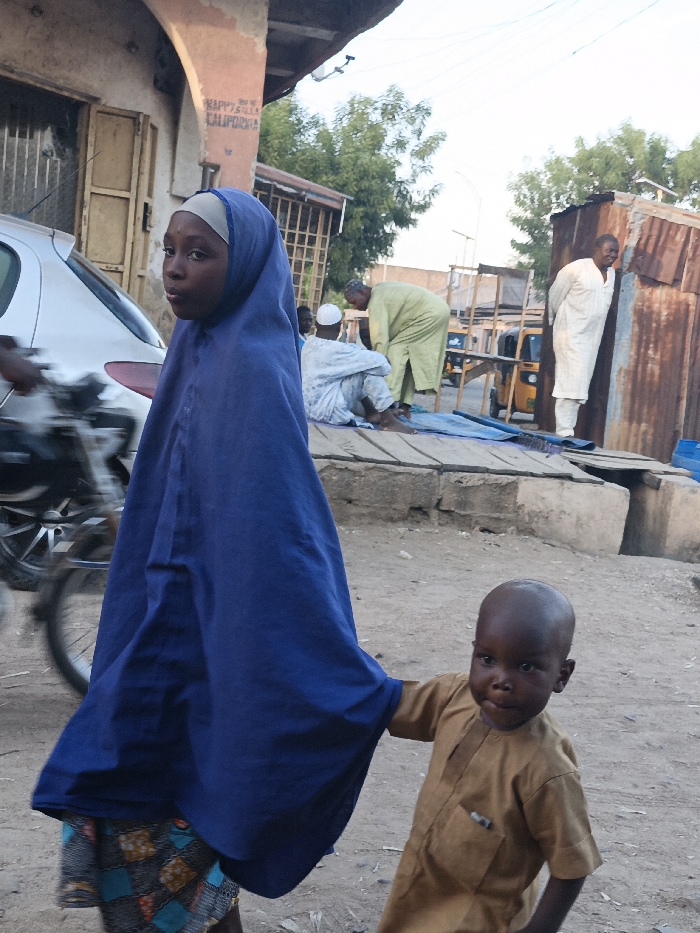 This image captures an outdoor street scene in Gwagwarwa, Nigeria. In the immediate foreground, a young female, likely a child or adolescent, walks leftward, directly facing the camera. She wears a deep blue, long-sleeved garment, possibly a hijab, over a lighter head covering and a patterned skirt. To her right and slightly behind, a toddler in a tan long-sleeved tunic walks forward, gripping the blue garment of the female, and also looks directly at the camera. The ground is unpaved earth. In the mid-ground, to the left, the rear quarter of a silver car is visible. Partially obscured by the female subject is the front wheel and handlebars of a motorcycle, exhibiting motion blur, suggesting movement. Further into the mid-ground, a raised concrete or stone platform supports wooden planks. On or near this platform, several adult males are present. One man, clad in white traditional attire and a white cap, is seated barefoot on a blue mat. Another man, wearing a light green tunic, is positioned bending over near the seated man. To the far right, an adult male in a white traditional tunic stands leaning against a rusted corrugated metal building. In the background, a yellow tricycle (keke napep) is visible on a road. The environment includes various structures: a reddish-brown building with an arched entrance on the left, featuring closed wooden doors and a partial sign that reads "HAPPY SALLAH CALIFORNIA". Further structures include another building with vertical metal bars over an opening and the corrugated metal building. Trees with green foliage are visible against the clear sky. The scene is illuminated by natural daylight.
