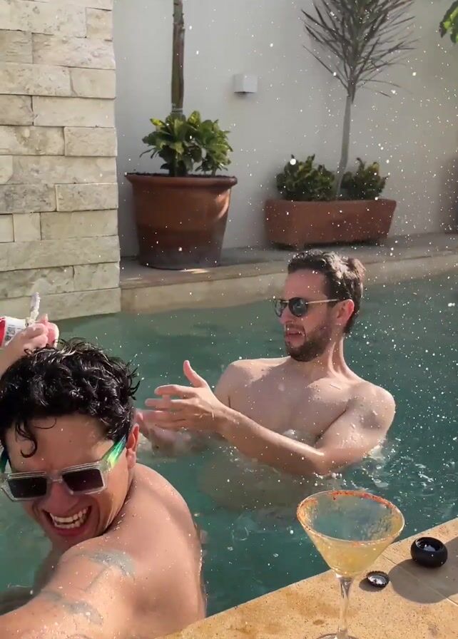 Three men are in a small pool area. Two men are in the pool, while the third is partially visible from the shoulders down. The man closest to the camera has dark hair and tattoos on his back. The man in the center of the pool is wearing sunglasses. He's holding and splashing a can of beer, then drinks from it. A third man is partially visible near him. The pool has a light blue tint. The pool's edge is made of light brown stone, and a half-empty margarita with a chili salt rim sits on the edge with a black bottle cap nearby. Potted plants adorn the white walls of the pool area. It's daytime, and the lighting is bright. Music is playing in the background.