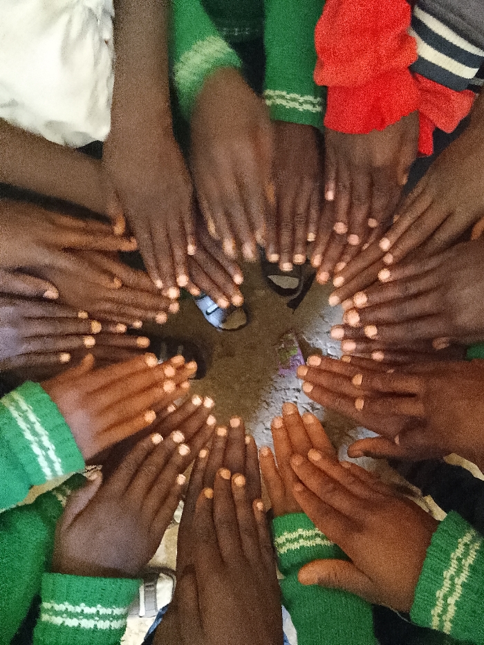 An overhead view captures numerous hands, approximately fifteen, belonging to individuals with dark brown skin, arranged in a tight circle on a textured, brownish-grey ground surface