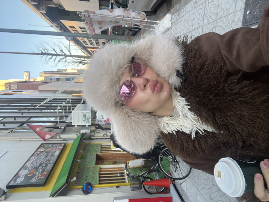 A person poses outside. They wear a furry hat, pink sunglasses, and a brown jacket. The background shows a street with buildings and shops. There's a bicycle parked nearby and an orange traffic cone. The person is holding a cup.